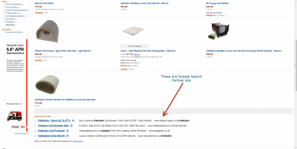 These ads, down near the bottom, are Google Search Partner ads. Fair enough. After all, this was a search for a particular keyword on Amazon.